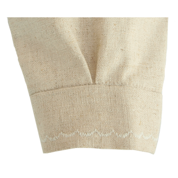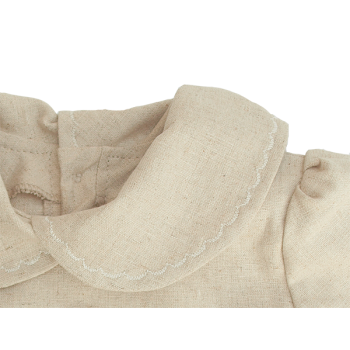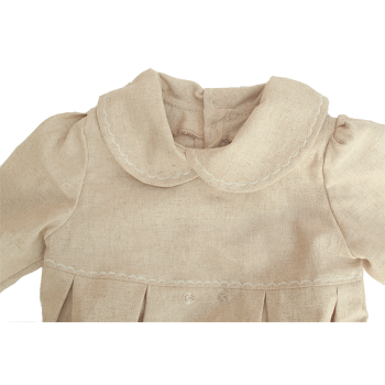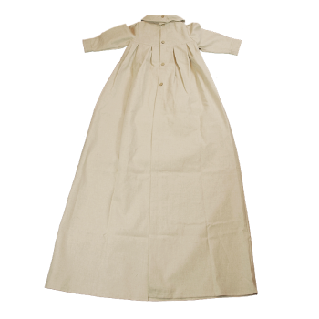 Dopklänning av oblekt naturtyg. Tyget har vackert fall och därtill bomullens bekvämlighet när det gäller skrynkeltålighet. Modellen är ren, fin och enkel och passar både pojkar och flickor. Dopklänningen har 6 st veck framtill och även små veck mot den lilla manschetten runt handleden. Maskinbroderi ton-i-ton på manschetterna, kragen och på överdelen. Knapparna bak är av kokos. En knapp sitter i kragen och fyra i ryggen, därefter är dopklänningen öppen.