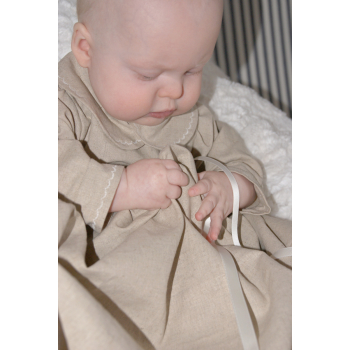 Dopklänning av oblekt halvlinne. Enkel stilren modell med band och rosett av oblekt lin med vit kant.