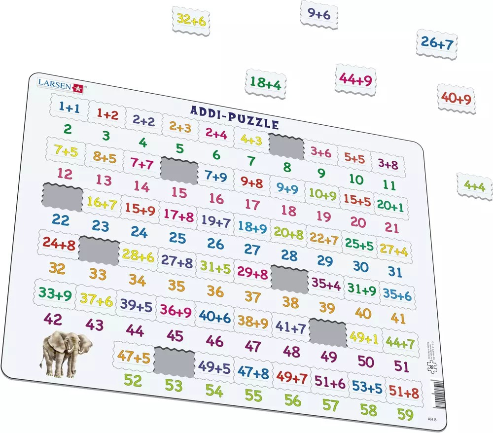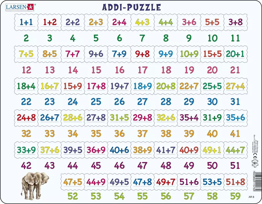 Detta pedagogiska matematikpussel hjälper barn att lära sig räkna upp till 59. Barnen kommer att ha mycket roligt när de löser problemen på varje pusselbit. I detta pussel finns det 58 uppgifter och bitar med vågiga kanter som passar in på rätt plats i ramen.