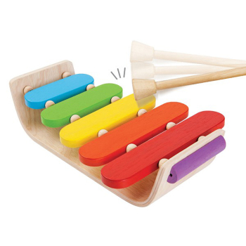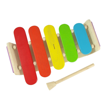 Xylofon av trä. Från PlanToys ekologiska tillverkning. Med träklingande, ganska dovt ljud. Fem tonblock som var och ett ger ett eget ljud när man slår på det med träklubban. Samtliga delar är tillverkade av massivt trä. Glada, fräscha, giftfria färger. Gediget och hållbart. Tränar finmotorik, koordination, ljudupplevelse och färger.